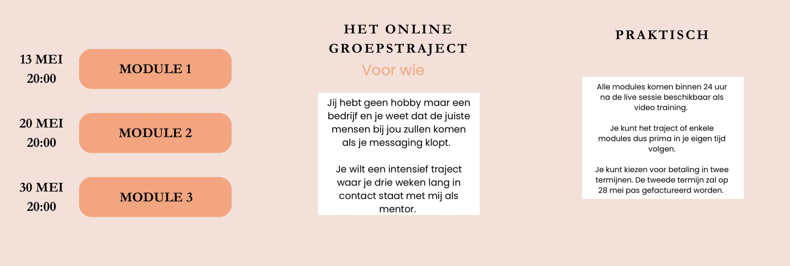 Gedurende dit traject staat iedere deelnemer in contact met mij, én elkaar, via een exclusieve whatsapp groep. Hier door kunnen we elkaar helpen met de juiste messaging en ben ik er dagelijks voor je om je van feedback te voorzien! Het wordt een fijne groep waarin je samen met mij je perfecte story telling gaat schrijven en je deze methode van schrijven gaat integreren in je bedrijf, zodat je net als ik ook een master wordt in online story telling. Door deze modules zal Met dit onderdeel van het traject kom ik je letterlijk je verdienmodel brengen.